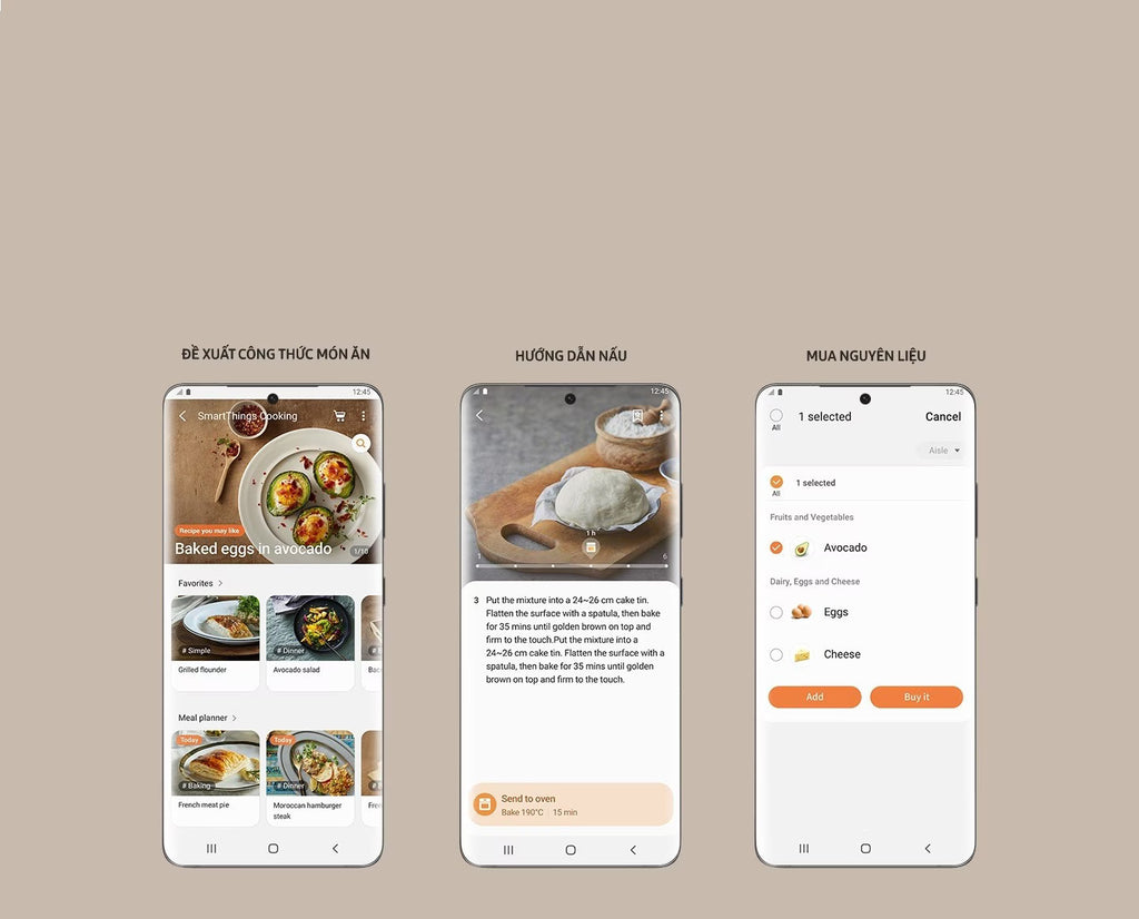 Nấu nướng tự động qua SmartThings Cooking giúp điều chỉnh lò nướng tự động và hướng dẫn người dùng từng bước theo công thức gợi ý ngay trên lò hoặc điện thoại thông minh.